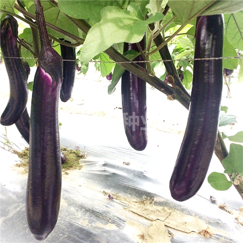 早中熟,生长势强,植株健壮,连续结果能力强,稳产高产。果实长棒型,果长36-40厘米,横径5厘米左右,单果重500克左右,果皮紫红发亮有光泽,果肉白色,茄条顺直、硬实。商品性好,品质佳,货架期长,耐贮运,耐热且不易褪色。