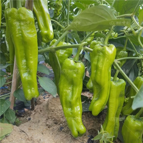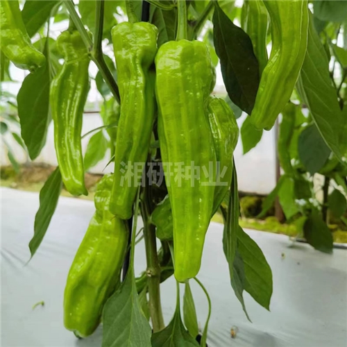 大果、浅绿色薄皮泡椒,中早熟,果实长灯笼型,有竖皱,青熟果黄绿色,肉质清脆,微辣,口感好,抗病抗逆性强,产量高,种植薄皮泡椒地区的主推品种。