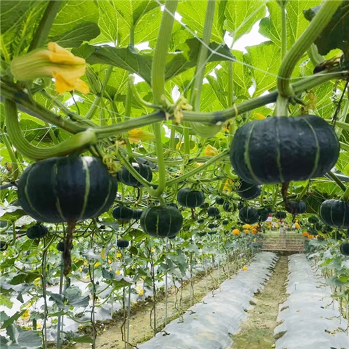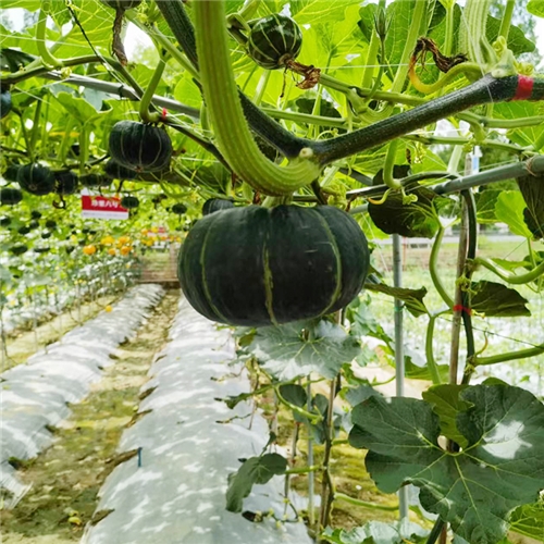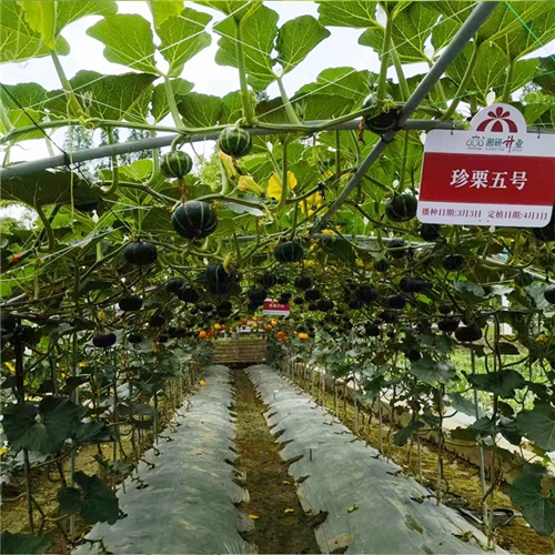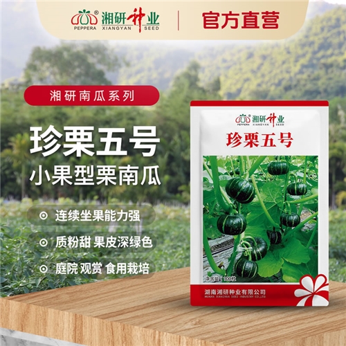 小果型栗南瓜杂交一代新品种,植株半蔓性,前期生长较快,第一雌花节位6-8节,主侧蔓均可结瓜,连续坐果能力强,一般单株可坐果4-6个,果实成熟期35天左右,平均单瓜重500g左右,果实扁圆形,果皮深绿色,果面有浅棱沟,果形美观,商品性好,果肉黄色,肉厚,质粉甜,干物质含量高,品质风味佳,耐运输。可用作庭院栽培、观赏及食用栽培。大部分地区可作春、秋两季栽培。