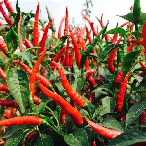 中熟、单生朝天椒品种,植株高大直立,青熟果绿色,红熟果橘红再转大红。果实单生,果尖细长,前后期果实一致性好,易于采摘,单果重4-5克,辣味浓,单株挂果多,丰产潜力大,耐湿热,抗性强,适合作青红鲜椒上市。