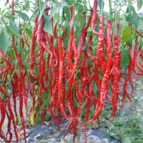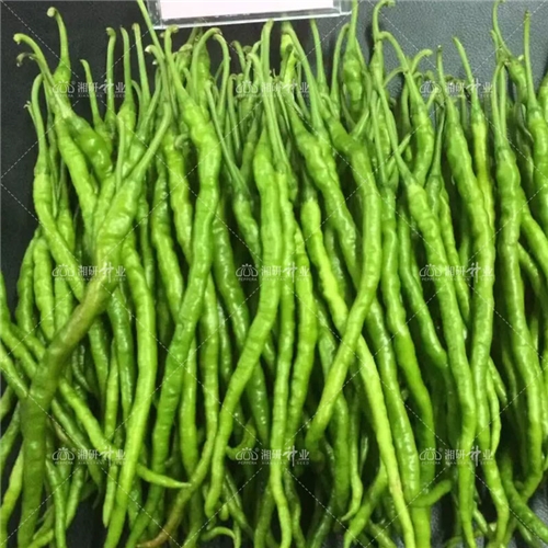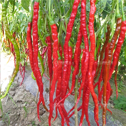 中熟、干鲜两用、长线椒品种。植株生长势强,叶色绿色:植株高大,株高70厘米,开展度65厘米;果实线形,绿色、光亮,果长28-30厘米,果宽1.4厘米,果肉厚0.15厘米,单果重约18克。红熟果深红色,易干制,味辣,连续坐果能力强,综合抗性好,适宜鲜椒上市或干制加工。