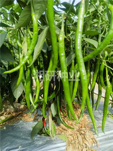 中早熟、顺直、深绿色长线椒品种。植株生长势强,型方正,分枝多,片小,色浓绿;果实细长、顺直,青熟果深绿色,顺直光亮,耐储运,前后期果实一致性好,红熟果红色,单果重25g左右,味辣;耐湿热、干旱,坐果性好,综合抗性强,适宜青鲜椒上市。