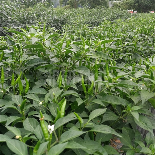 中熟、单生小果朝天椒品种。果实小指形,果长5-6厘米,果宽0.8厘米,果实朝天,单生,果表光亮,青熟果绿色,红熟果红色;辣味浓,干后皱少,单株挂果多,丰产潜力大,前后期果实一致性好;抗疫病及病毒病能力强,耐湿热,抗逆性较好,适合作鲜椒上市或干制加工。